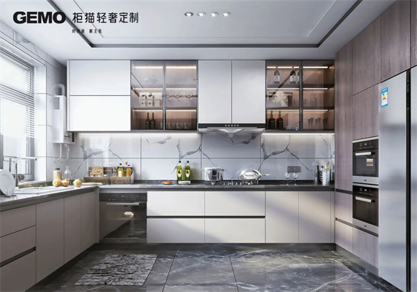 2、開放式廚房櫥柜的顏色和材質要與整個空間協調。如果廚房和客廳是一個空間,那么櫥柜的顏色和材質應該和客廳家具相協調。如果廚房和餐廳是一個空間,那么櫥柜的顏色和材質應該和餐廳家具相協調。