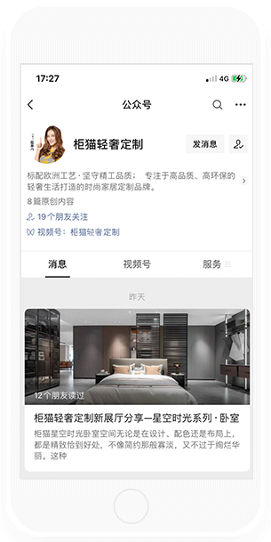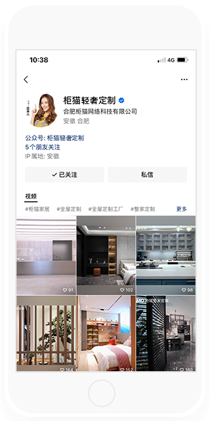 關注柜貓輕奢定制微信視頻號